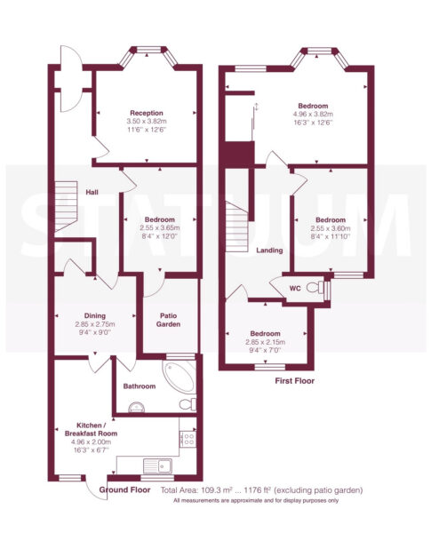 Arranged over two floors, the ground floor comprises a welcoming entrance hall, a bright reception room, a separate dining area and a spacious kitchen/breakfast room providing excellent storage and worktop space. The kitchen offers direct access to a private patio garden, ideal for outdoor dining and entertaining. A wellappointed family bathroom completes the ground floor.