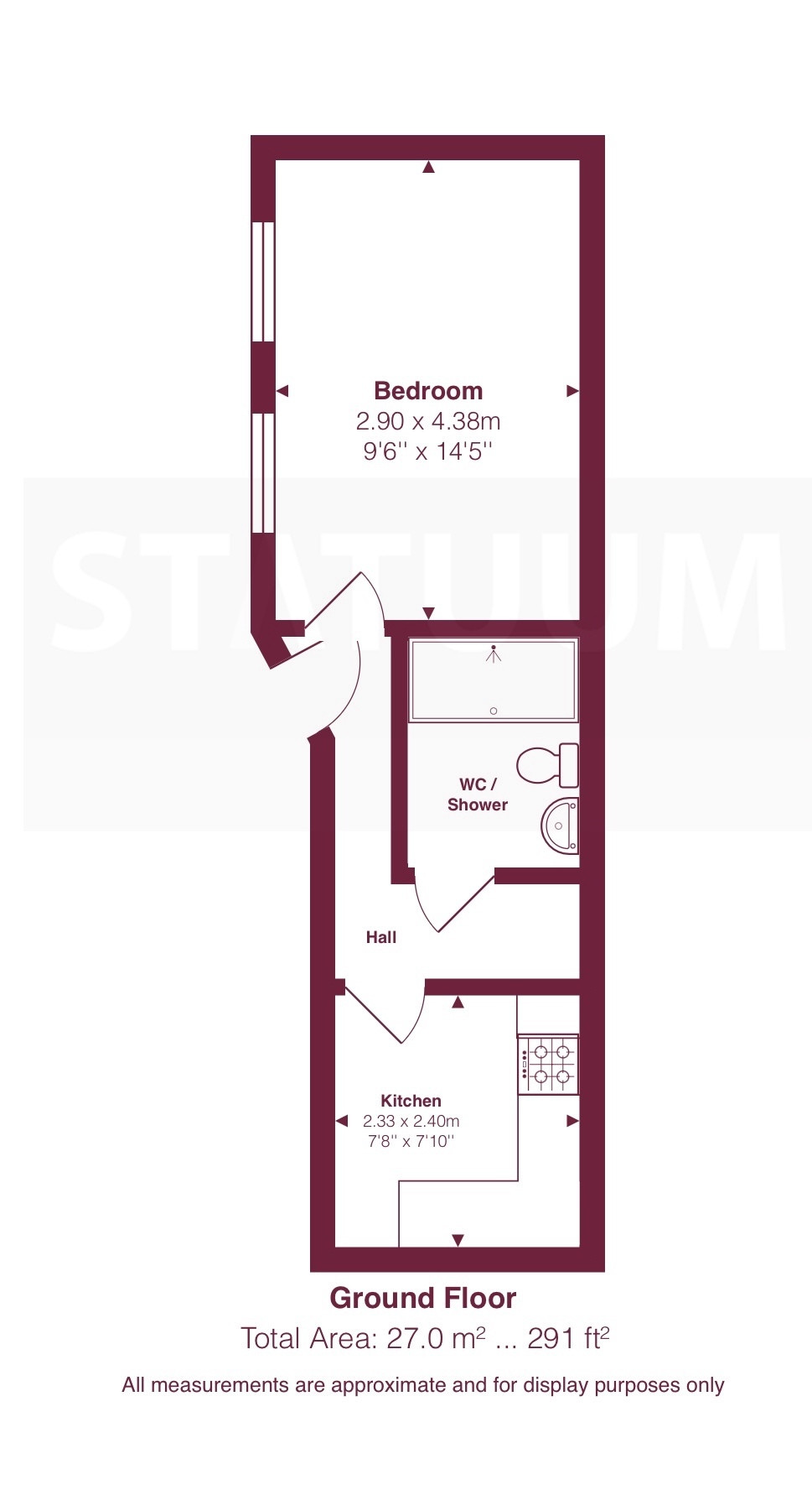 The property has been newly decorated throughout and features laminated wood flooring, creating a clean and modern living space. The layout comprises a spacious bedroom/living area, a separate fully fitted kitchen, and a modern WC with shower. The kitchen is fully fitted with ample storage and workspace, ideal for comfortable day-to-day living.