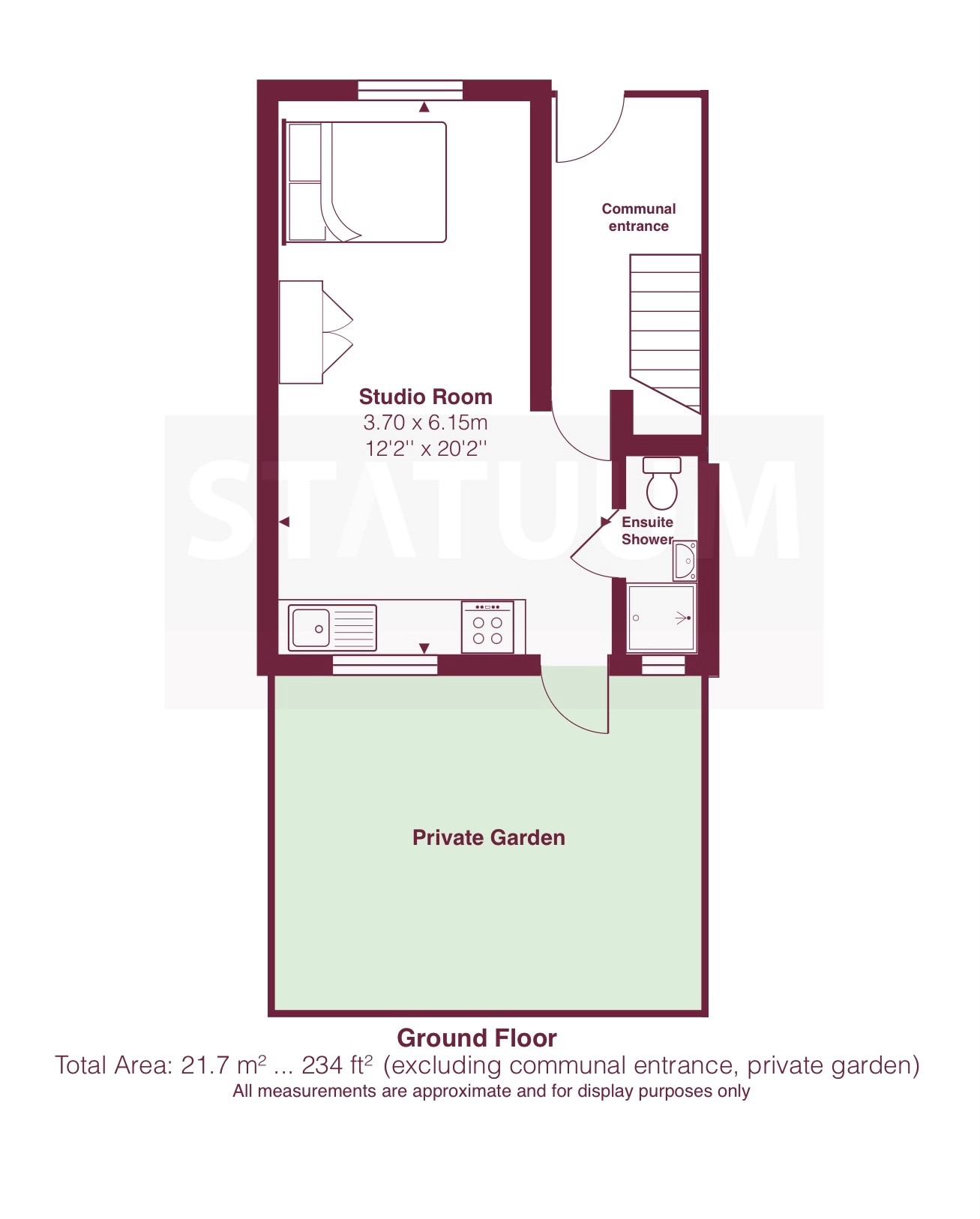 A standout feature of the property is the direct access to a private garden, offering valuable outdoor space rarely available with studio apartments in this area.